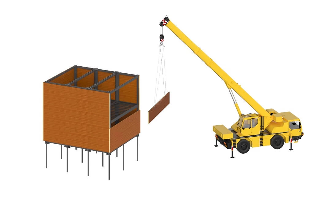 Здесь на вертикальные опорные стойки крепятся межэтажные и чердачные перекрытия. Для усиления конструкции модульного дома используются раскосины. Стеновой «пирог» также включают контробрешетку, гидроизоляцию, плиты утеплителя.