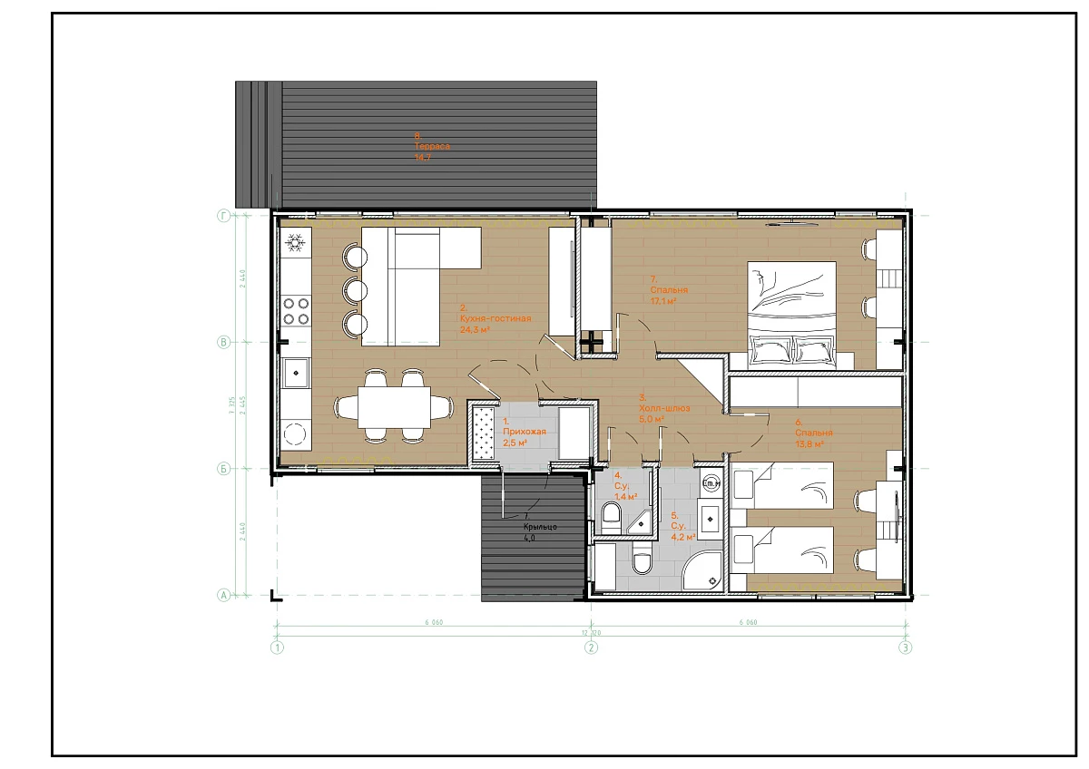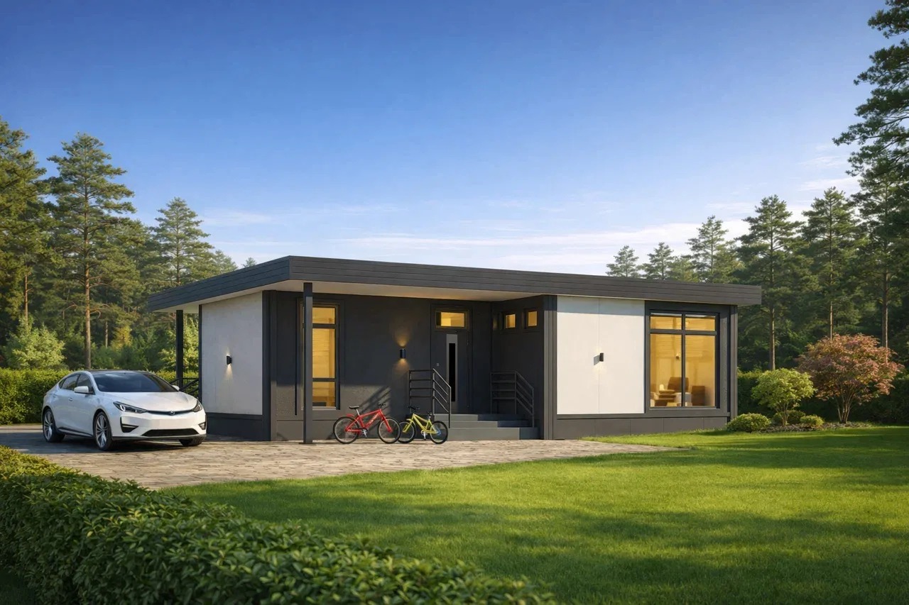 Домокомплект DOORHAN 103 ПРО — это устойчивый формат семейного дома. Две полноценные спальни и два санузла обеспечивают ежедневный комфорт для семьи с детьми. Пространство рассчитано на активную семейную жизнь, совместный отдых и прием гостей. Это сбалансированное решение для постоянного проживания.